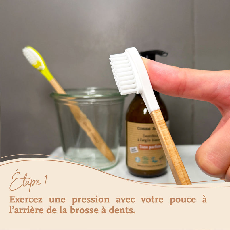 La brosse à dents est fabriquée en bois de hêtre français issu de forêts durablement gérées. Ses poils sont souples, ce qui convient aux gencives sensibles.