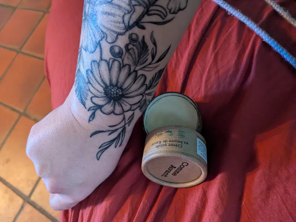 Son utilisation est très simple. Notre crème solide fond au contact de la peau (plus précisément de la chaleur de la peau), il suffit de la frotter dans ses mains et d'appliquer le dépôt doucement sur la peau ou les cheveux. Notre crème étant particulièrement concentrée, une petite quantité (un "trait") suffit à tous les usages même les peaux très sèches.