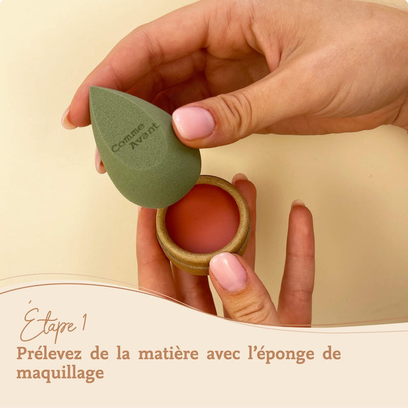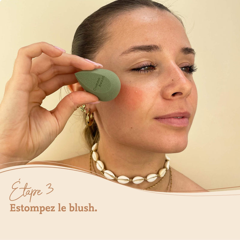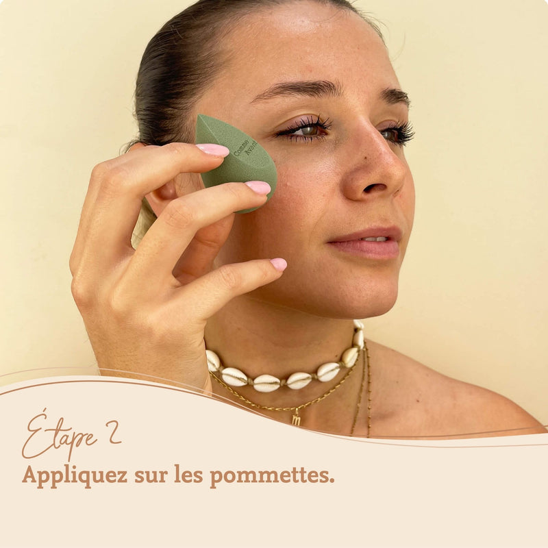 - Utilisez l’éponge de maquillage sèche pour une couvrance plus marquée et un rendu structuré.
