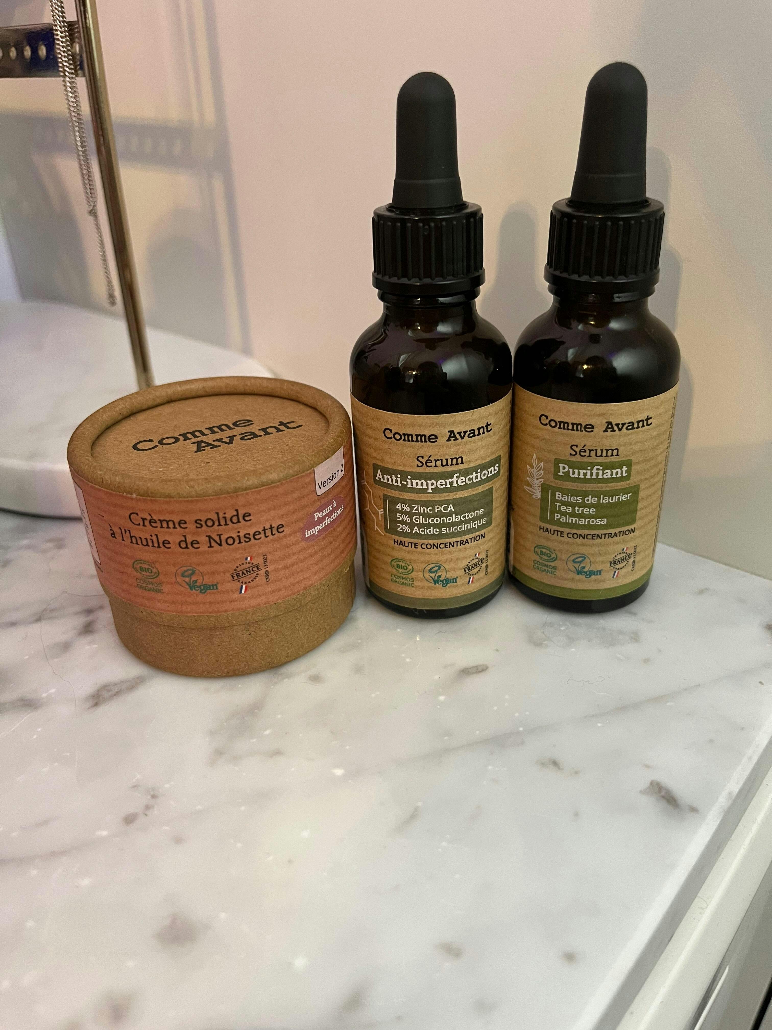 En cas d’imperfections visibles et enflammées, appliquez une petite quantité du sérum purifiant directement sur les boutons. Ce soin ciblé aide à purifier et calmer les zones inflammatoires, accélérant la cicatrisation et réduisant les rougeurs. Attention, le sérum purifiant est déconseillé aux femmes enceintes et allaitantes à cause de la présence d'huiles essentielles.