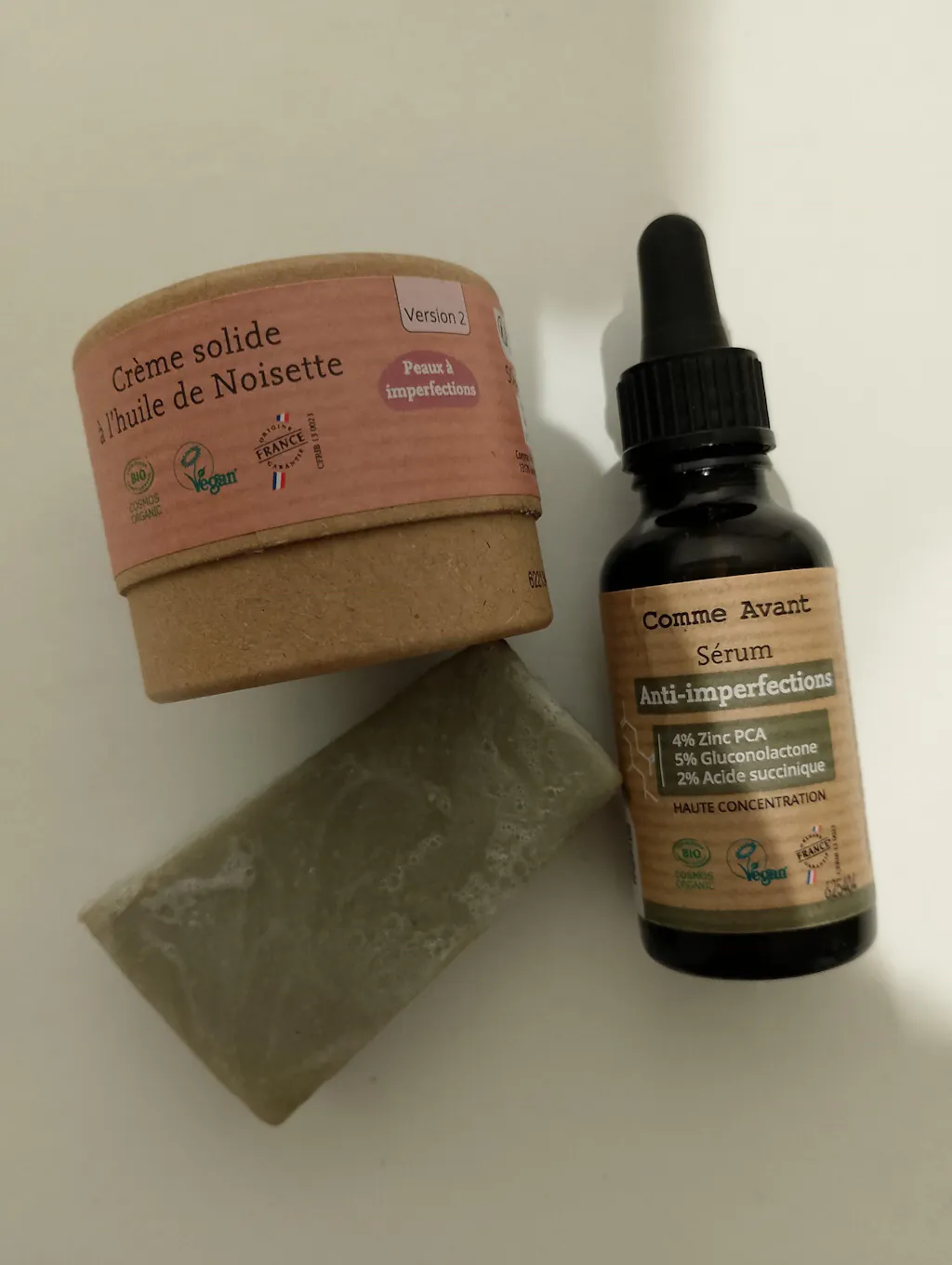 En complément du savon à l'huile de baies de laurier et de la crème à l'huile de noisette, c'est un combo parfait pour les peaux à imperfections de nos ados 😊
