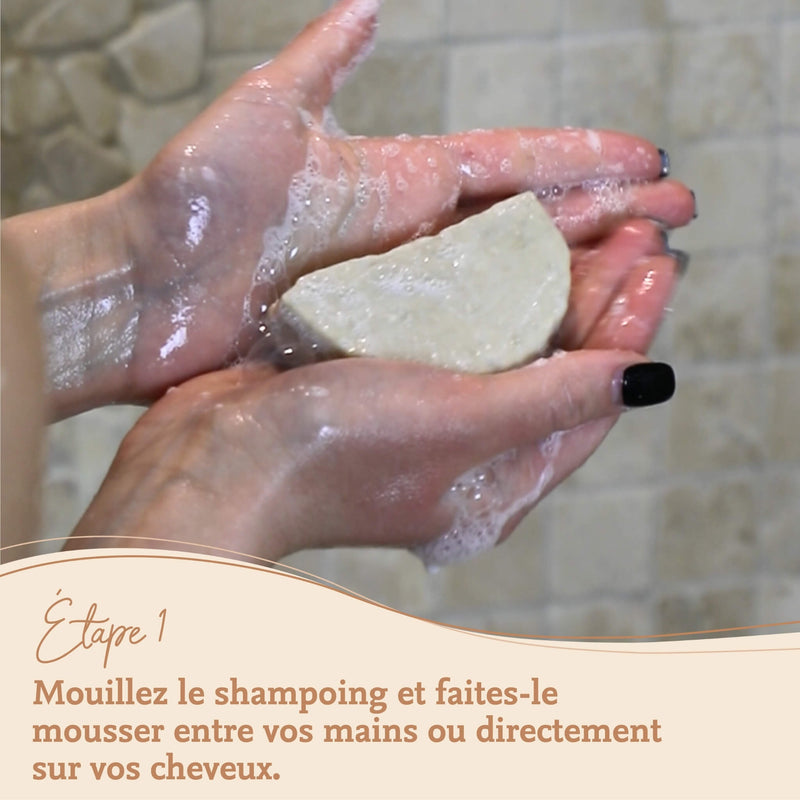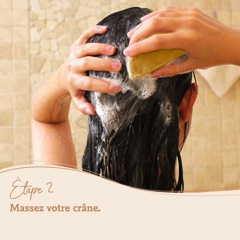 Lavez les racines de vos cheveux en massant doucement votre cuir chevelu.Pour les cheveux longs, il n’est pas utile de mettre du shampoing sur vos pointes, au rinçage le shampoing coulera sur les longueurs.Si nécessaire, vous pouvez effectuer un deuxième shampoing, notamment si vous avez les cheveux longs.Entre deux utilisations, conservez votre shampoing au sec, sur un porte-savon.Lorsque votre shampoing devient plus petit, vous pouvez le glisser dansun filet à savon en coton, cela permettra de l'utiliser jusqu'au bout sans en perdre une miette.