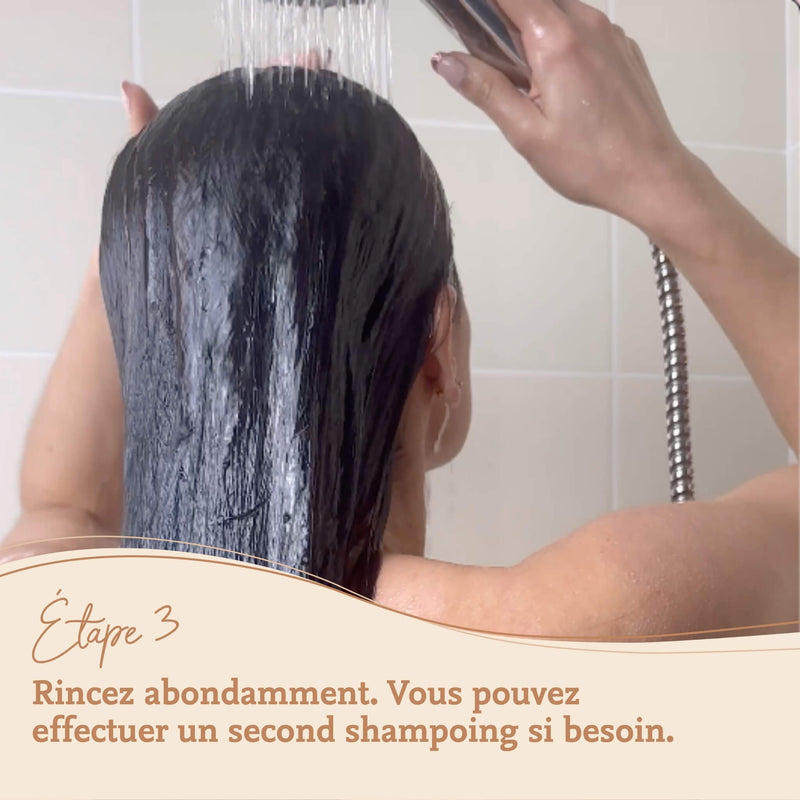 Il suffit de mouiller vos cheveux, puis de prendre le shampoing dans vos mains, le frotter et récupérer la mousse.