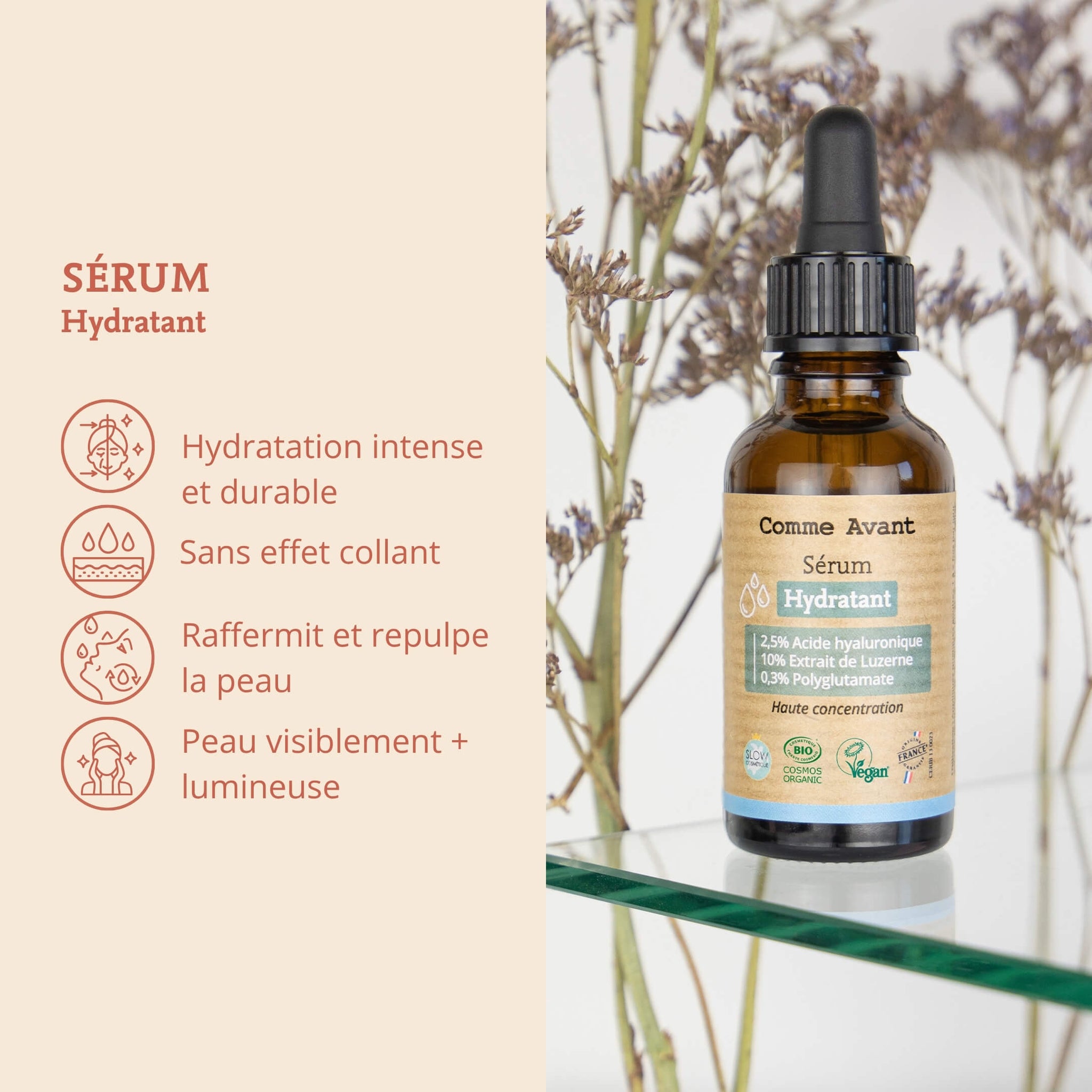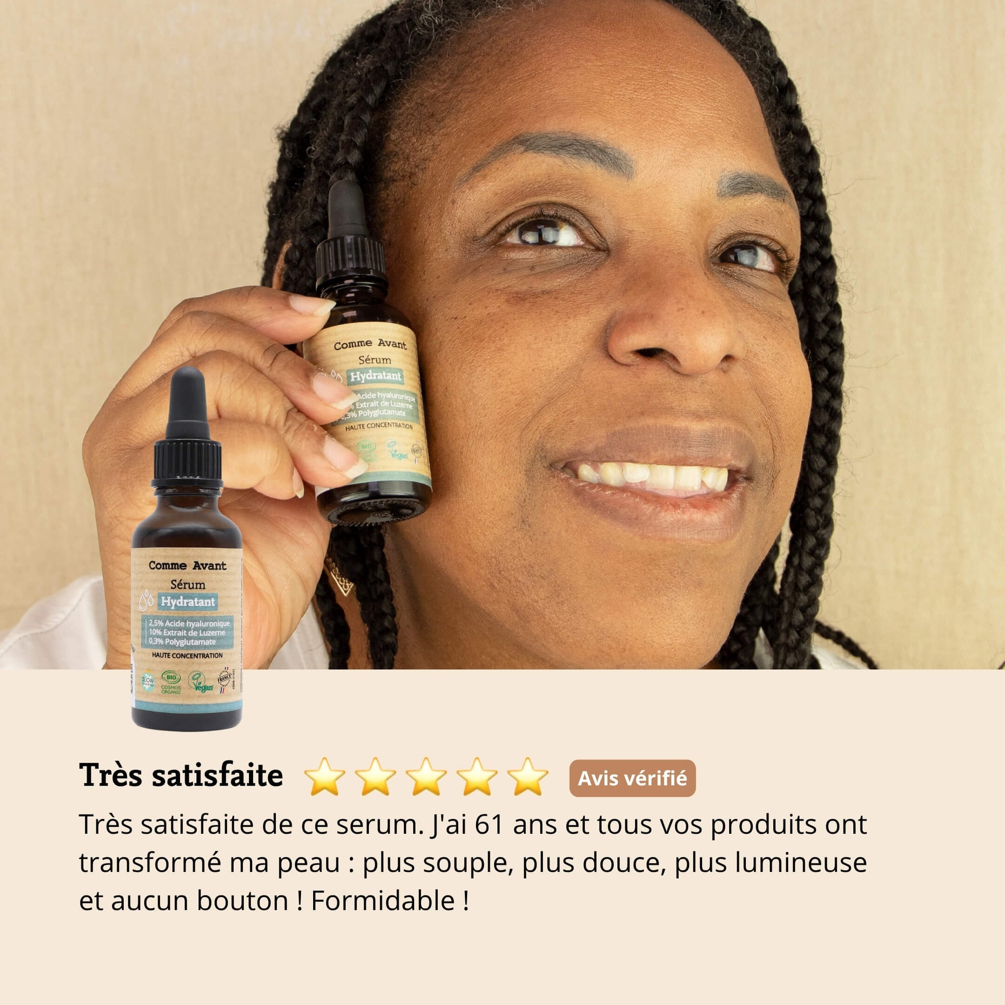 Marie jose J'utilise le sérum hydratant en duo avec le sérum anti-âge. Je l’ai découvert dans le coffret peau mature et anti âge. Très agréable à appliquer.