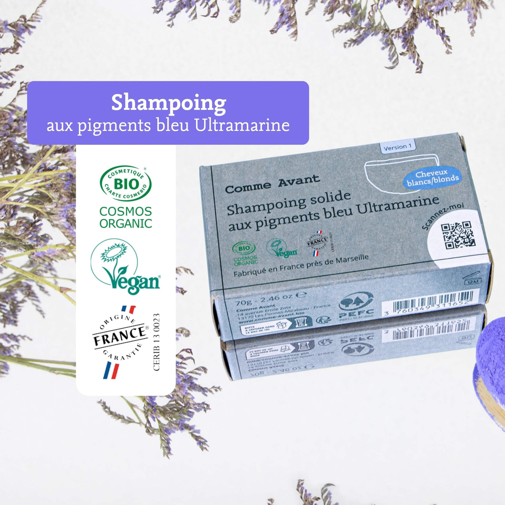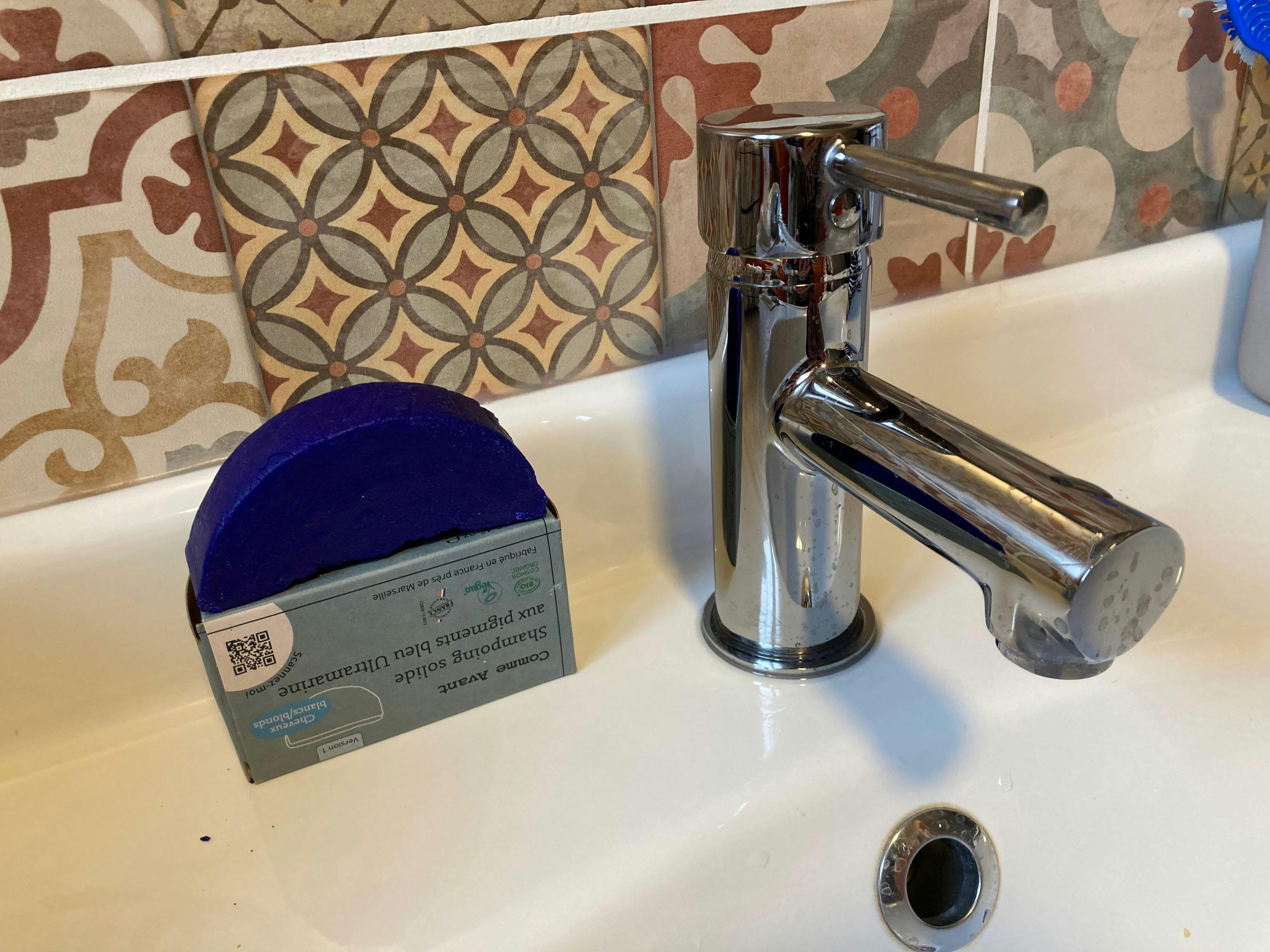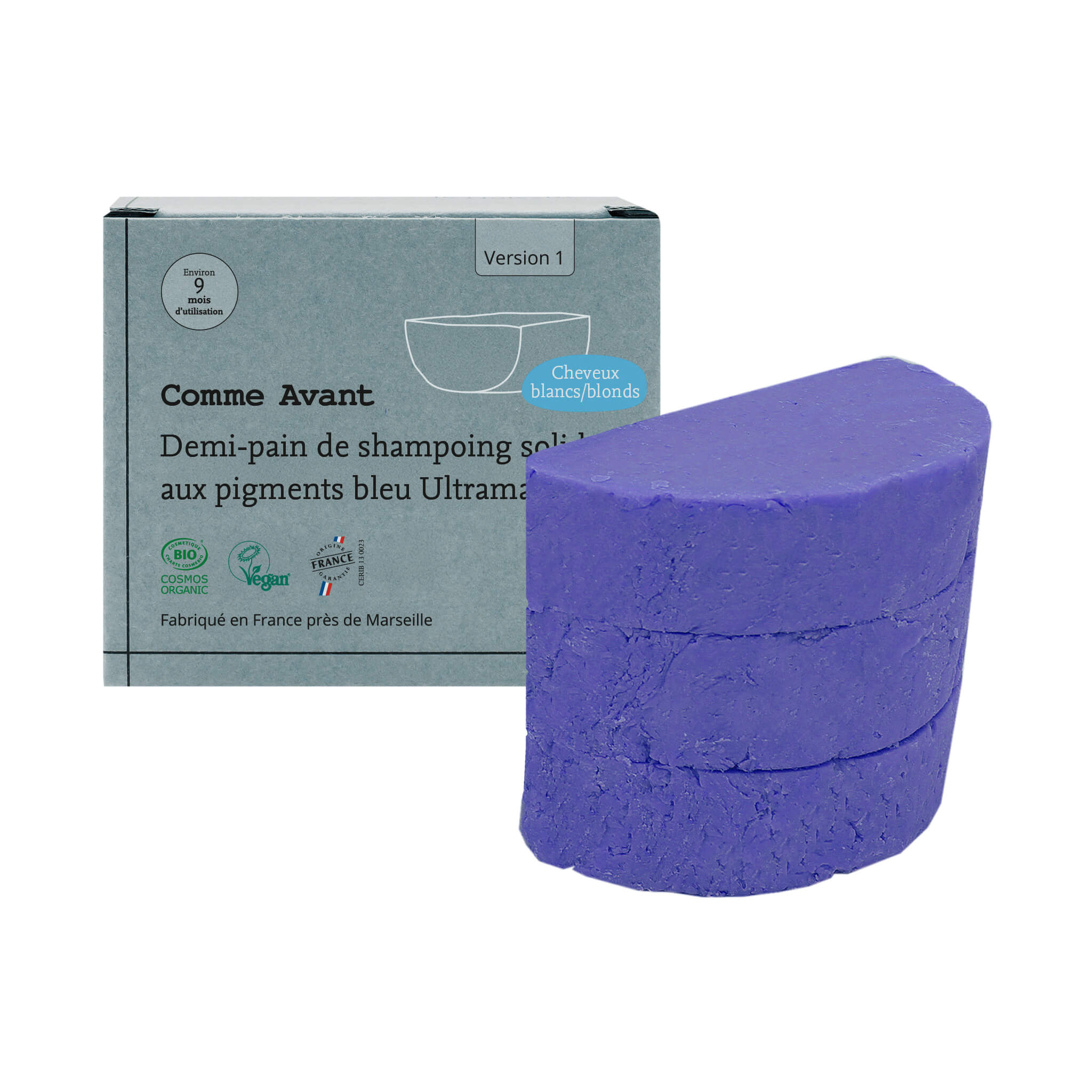 Shampoing solide cheveux blonds blancs aux pigments bleu Ultramarine - Version 1